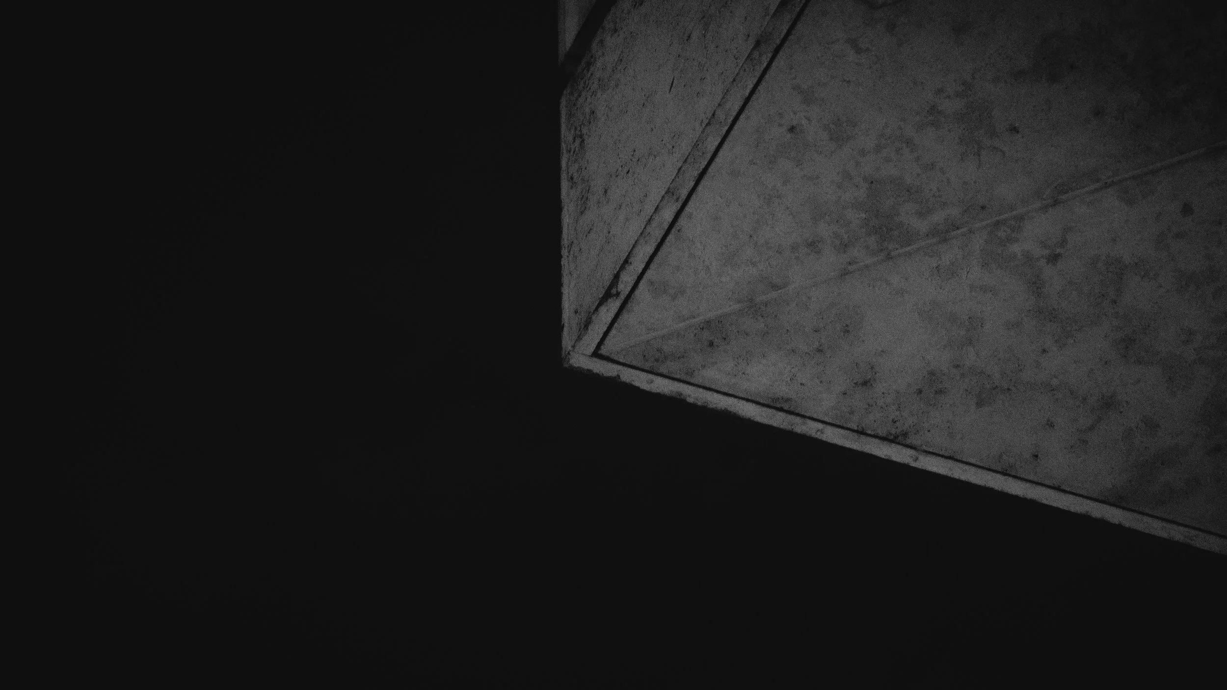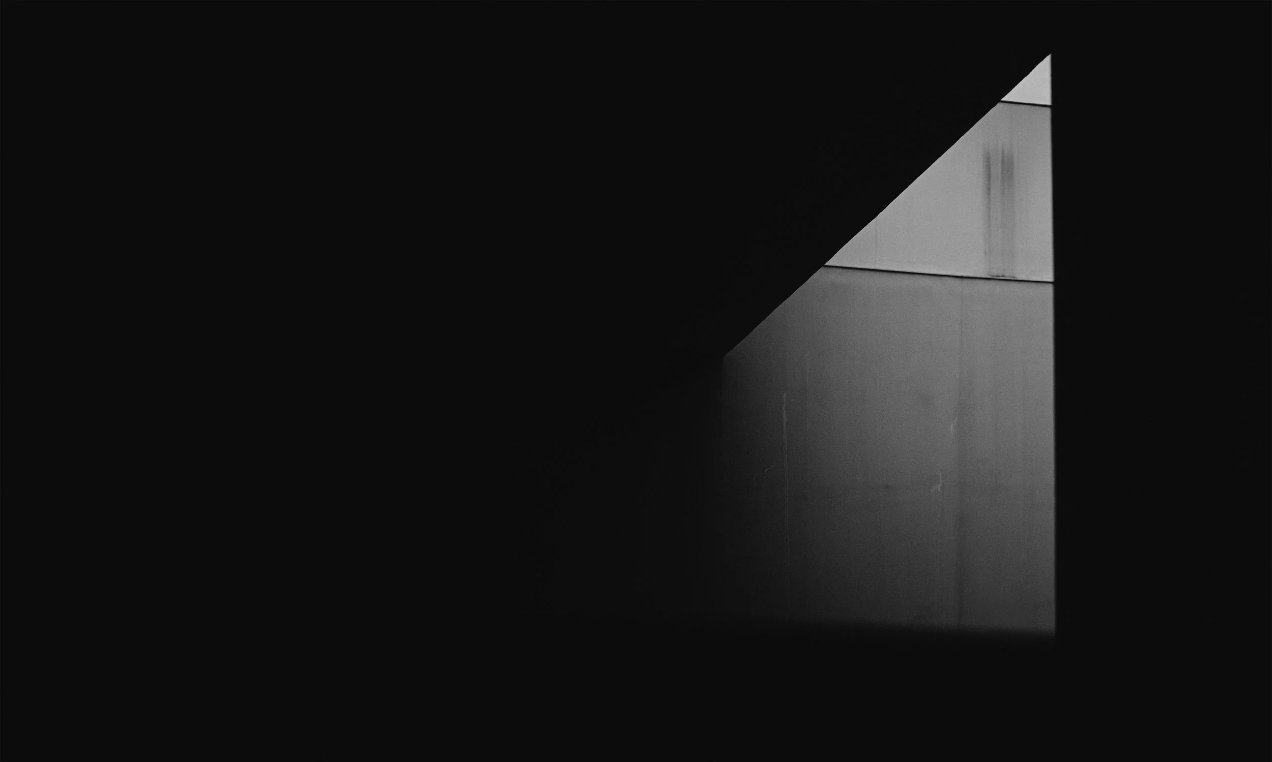 Pasillo oscuro con luz en una de sus paredes, en tonos grises y negros.